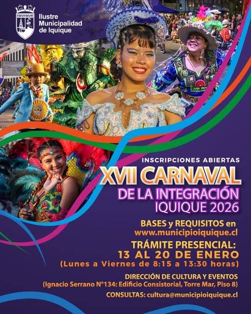 El XVII Carnaval Andino de la Integración Iquique 2026 se realizará los días sábado 7 y domingo 8 de febrero de 2026, a partir de las 18:00 horas, reuniendo a hasta 28 comparsas de la región de Tarapacá en una celebración que promueve la integración cultural, el rescate patrimonial y la identidad andina, consolidándose como un hito turístico y cultural de alcance regional.