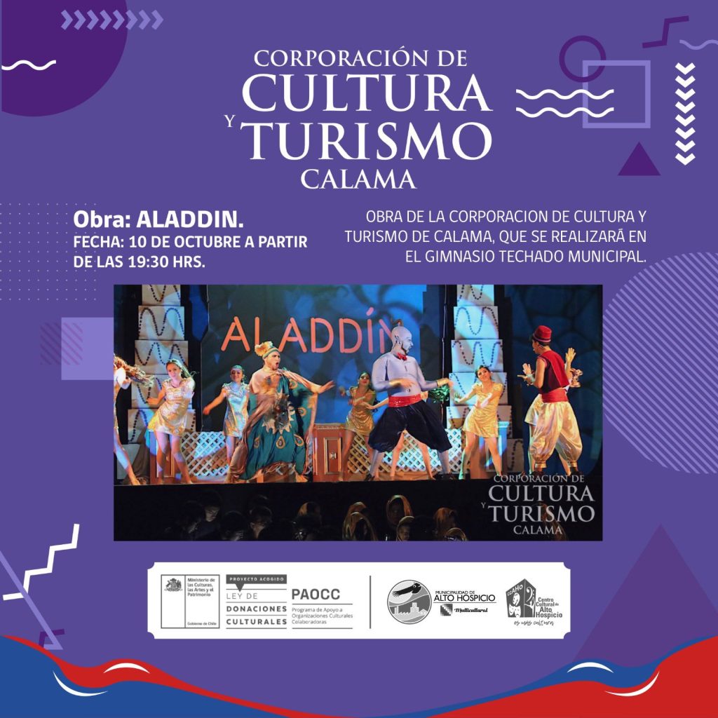 La magia del teatro se toma Alto Hospicio. Este viernes 10 de octubre, a las 19:00 horas, el Gimnasio Techado Municipal se convertirá en un palacio lleno de colores, risas y canciones con la presentación de la obra “Aladdin”, un espectáculo familiar que promete encantar a grandes y chicos con una puesta en escena de primer nivel.