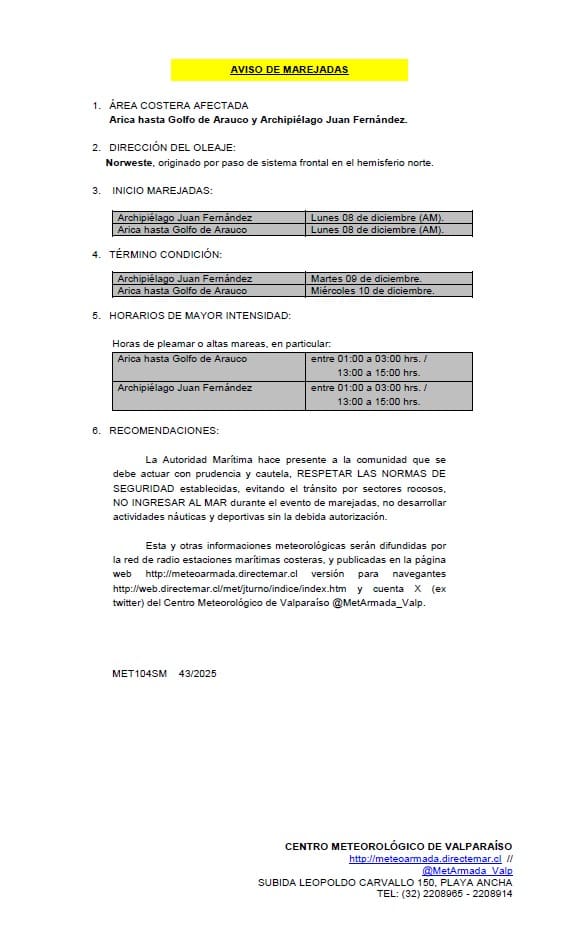 La Armada de Chile y el Centro Meteorológico Marítimo recomiendan: