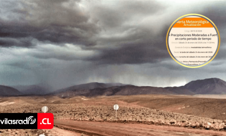 Según informó la Dirección Meteorológica de Chile, esta condición climática se mantendrá vigente durante toda la jornada de este sábado 24 de enero, afectando principalmente los sectores de precordillera y cordillera. Considerando para la Región de Tarapacá la alerta AA15-6/2026 que detalla los montos de agua podrían alcanzar los 25 mm en el área cordillerana y hasta 20 mm en la precordillera.