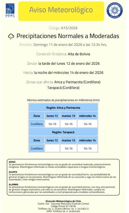 Junto con la actividad eléctrica, se pronostican precipitaciones normales a moderadas que se concentrarán principalmente en el sector cordillerano a partir de la tarde del lunes 12 de enero. El evento, que se prolongará hasta el miércoles 14, podría generar riesgos para las personas y la conectividad vial, dado el potencial de escurrimiento en quebradas producto de los montos de agua estimados para estas jornadas en la zona extrema.