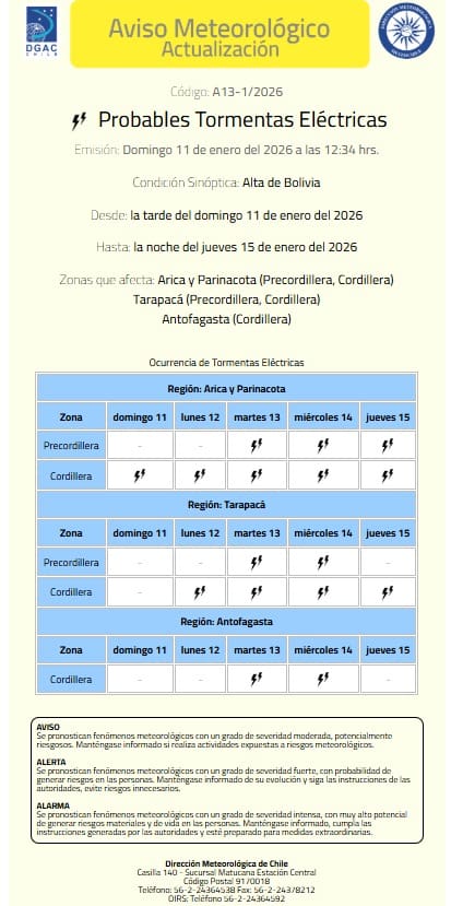 En ese sentido, la Dirección Meteorológica de Chile detalló que la inestabilidad atmosférica se extenderá por gran parte de la semana. “Desde la tarde de este domingo 11 de enero y hasta la noche del jueves 15, se prevé la ocurrencia de tormentas eléctricas en la Precordillera y Cordillera de las regiones afectadas. Este fenómeno cuenta con un grado de severidad moderada, por lo que se recomienda a la población mantenerse informada si realiza actividades expuestas a riesgos”, detalló el informe oficial.