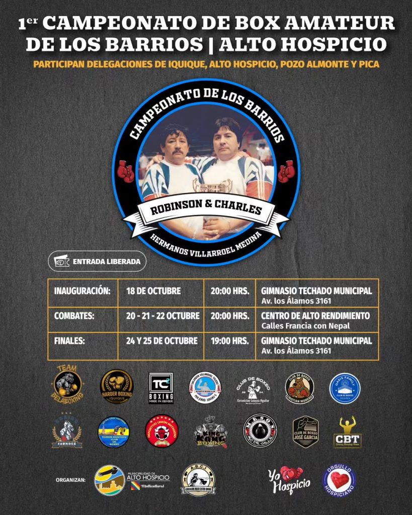 El evento, que es organizado por la Asociación de Boxeo Centro Iquique y la Municipalidad de Alto Hospicio, será inaugurado el sábado 18 de octubre a las 20:00 horas, en el Gimnasio Techado Municipal, ubicado en calle Av. Los Álamos N°3161 de la citada comuna.