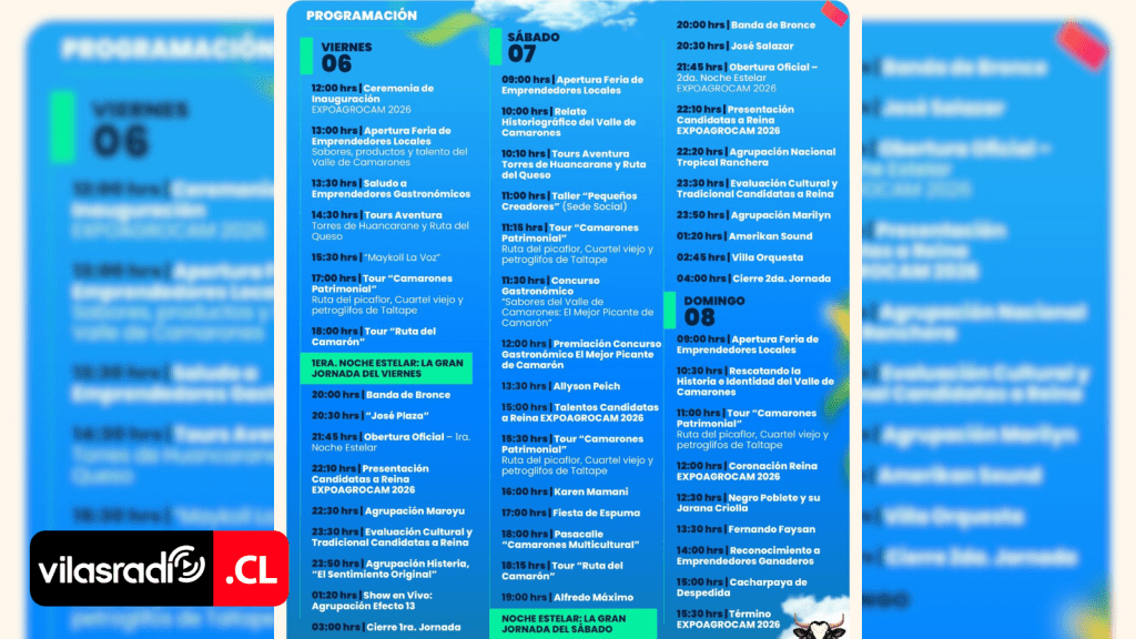 Finalmente, el municipio invitó a los turistas a sumergirse en los sabores locales a través de cocinerías tradicionales y un exclusivo concurso culinario, consolidando a la ExpoAgroCam como el evento estival más relevante de la zona, reafirmando el compromiso de la gestión con la vida en el territorio y el fomento del turismo rural. Se espera que miles de visitantes lleguen a disfrutar de estos tres días de celebración en el corazón del valle.