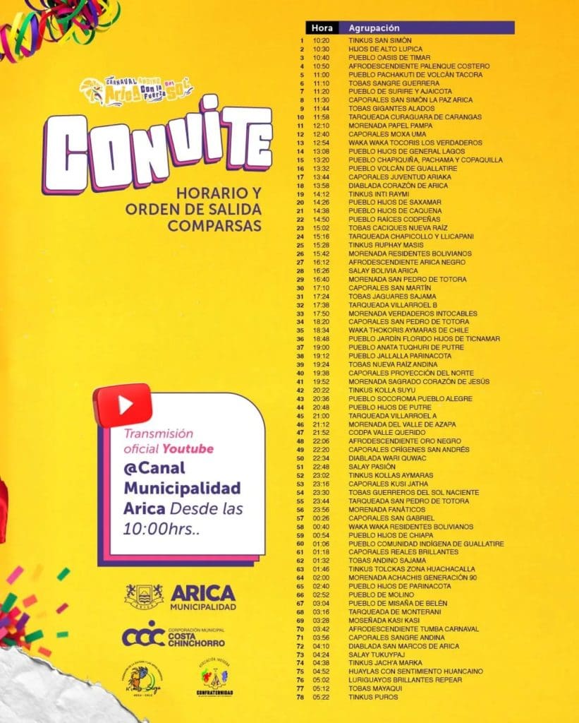 Si aún no te has sumado, todavía estás a tiempo de vivir esta experiencia que une culturas. El recorrido oficial cuenta con el orden de participación de todas las comparsas, desde las Morenadas con su paso imponente hasta los alegres Caporales y los ritmos ancestrales de los Pueblos Originarios. Recuerda que este es solo el adelanto; la fuerza de los pies y los instrumentos se mantendrá encendida durante toda la noche, transformando a Arica en el epicentro de la alegría nortina.