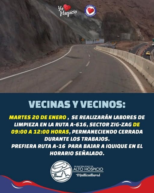 La Municipalidad, organismo ejecutor del operativo, destacó los detalles técnicos de la planificación para esta jornada. “Con motivo de un operativo de limpieza municipal, la ruta A-616, sector Zig-Zag, permanecerá cerrada de manera temporal el martes 20 de enero, entre las 09:00 y las 12:00 horas. Durante ese horario no habrá tránsito vehicular por la ruta”, informó la entidad edilicia a través de sus canales oficiales.