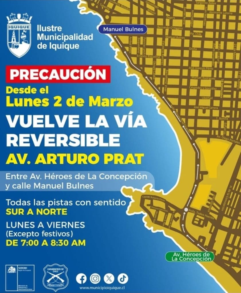 Con el fin de las vacaciones y el retorno masivo a las actividades escolares y laborales, la Municipalidad de Iquique, en coordinación con la Seremi de Transportes y Telecomunicaciones, confirmó el regreso de la vía reversible en la Avenida Arturo Prat. Esta estrategia es clave para agilizar el traslado de miles de iquiqueños que se desplazan desde el sector sur hacia el centro y norte de la ciudad durante las horas punta.