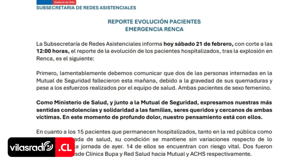 La Subsecretaría de Redes Asistenciales actualizó el estado de la emergencia en Renca, confirmando que la cifra de fallecidos se elevó a seis personas. El informe, emitido este sábado 21 de febrero, detalló el sensible deceso de dos mujeres que se encontraban internadas en la Mutual de Seguridad, quienes no lograron sobrevivir a la gravedad de sus quemaduras pese a los esfuerzos médicos.