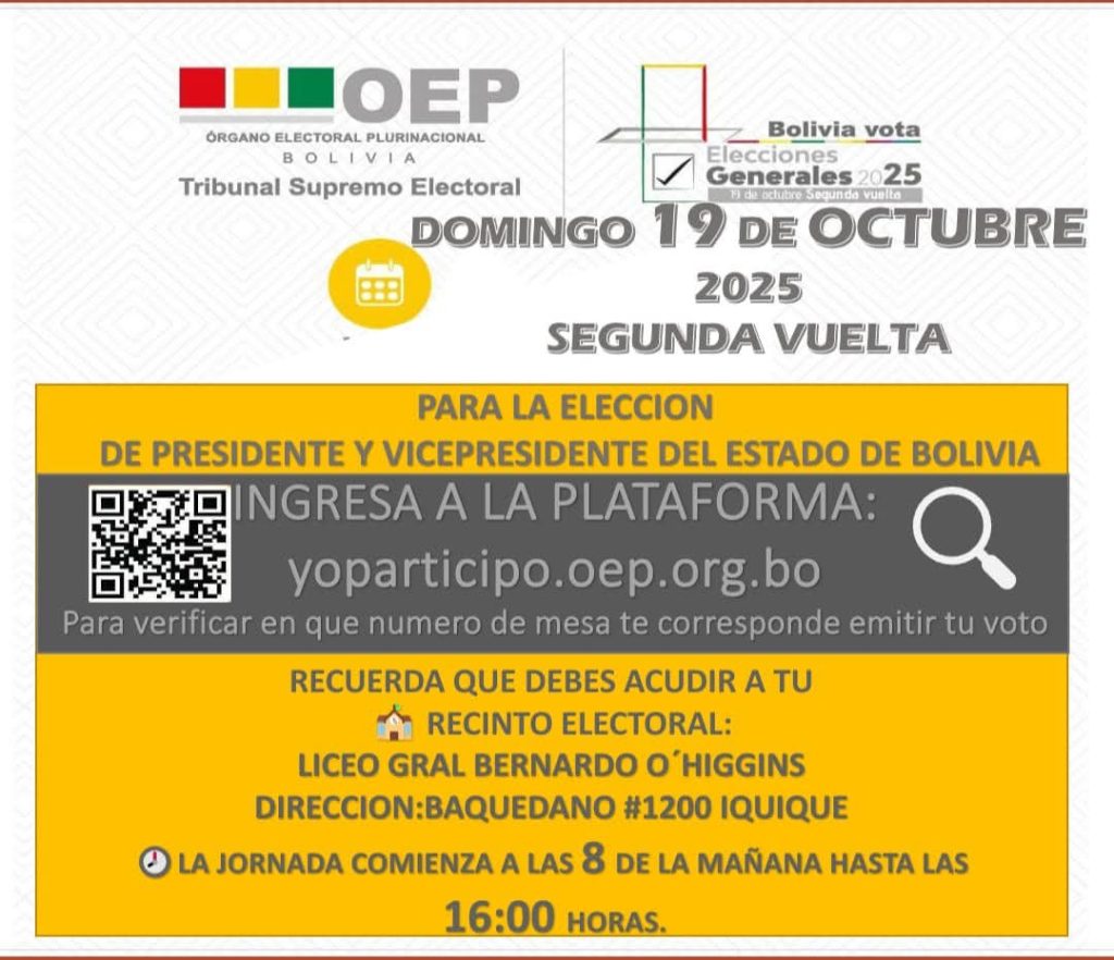 Los bolivianos residentes en Iquique podrán ejercer su derecho al voto este domingo 19 de octubre, entre las 08:00 y las 16:00 horas, en el Liceo General Bernardo O’Higgins, ubicado en Baquedano N° 1200. Así lo confirmó el Órgano Electoral Plurinacional (OEP) de Bolivia, a través del Tribunal Supremo Electoral (TSE), en el marco de la segunda vuelta de las Elecciones Generales 2025, donde se elegirá al próximo Presidente y Vicepresidente del Estado boliviano.