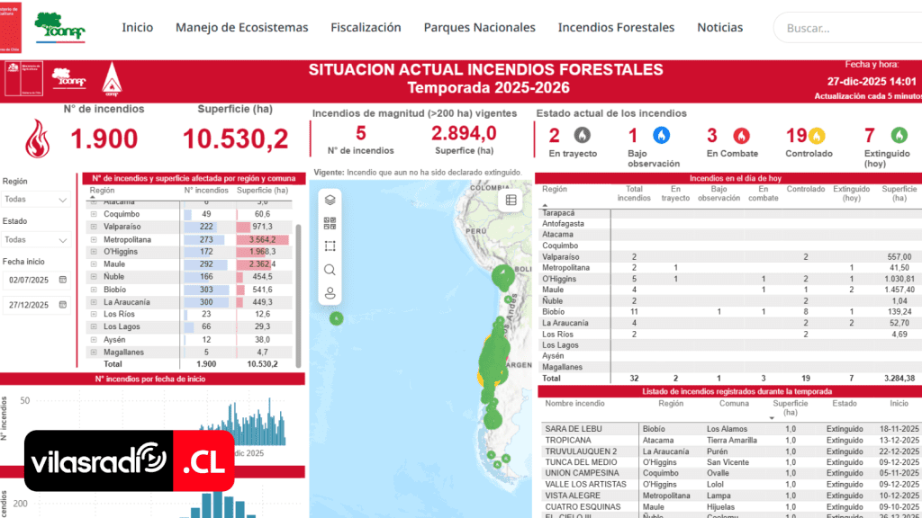 La Corporación Nacional Forestal (CONAF) activó la herramienta preventiva Botón Rojo en un total de 144 comunas del país debido a las condiciones climáticas críticas que favorecen la propagación de las llamas. La medida, que rige en zonas con una probabilidad de ignición igual o superior al 70%, se mantendrá vigente hasta el 30 de diciembre para enfrentar un escenario de altas temperaturas que podrían superar los 36 grados en el valle central.