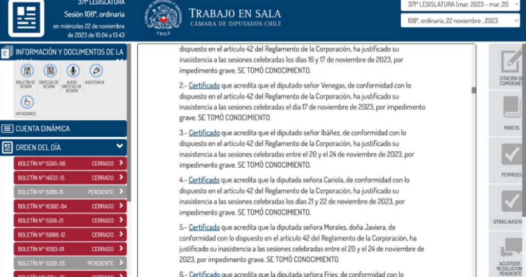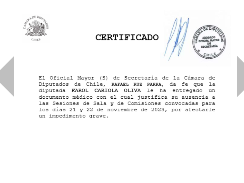 El caso de Karol Cariola es el que exhibe mayores inconsistencias. En la web de la Cámara figuraban simultáneamente tres razones distintas para su ausencia del 22 de noviembre: impedimento grave, permiso sin goce de dieta y un documento médico que supuestamente acreditaba la imposibilidad de asistir.