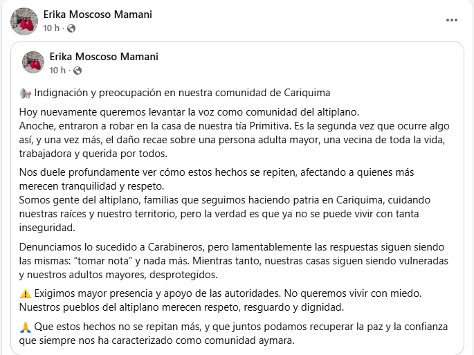 Para la comunidad, no es solo una noticia: es una herida que se repite. La señora Primitiva, una mujer aymara de trabajo incansable y corazón generoso, representa el espíritu de los pueblos del norte. “Nos duele verla así, porque ella es parte de nuestra historia, de nuestra raíz”, escribió Erika Moscoso Mamani, vecina que hizo público el hecho a través de redes sociales.