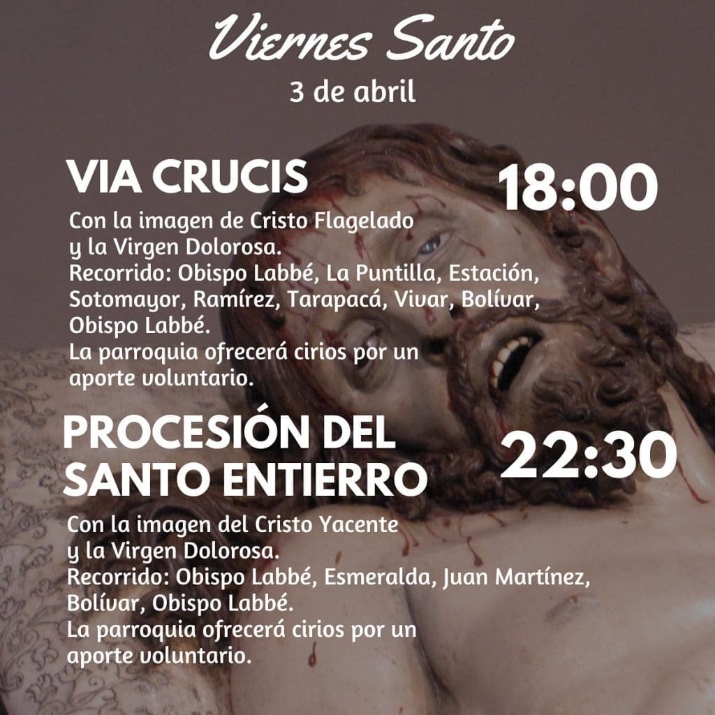 Ese día se llevará a cabo el Vía Crucis por distintos puntos del centro de Iquique, junto a la imagen de Cristo Flagelado y la Virgen Dolorosa, convocando a la comunidad a participar activamente en el recorrido.