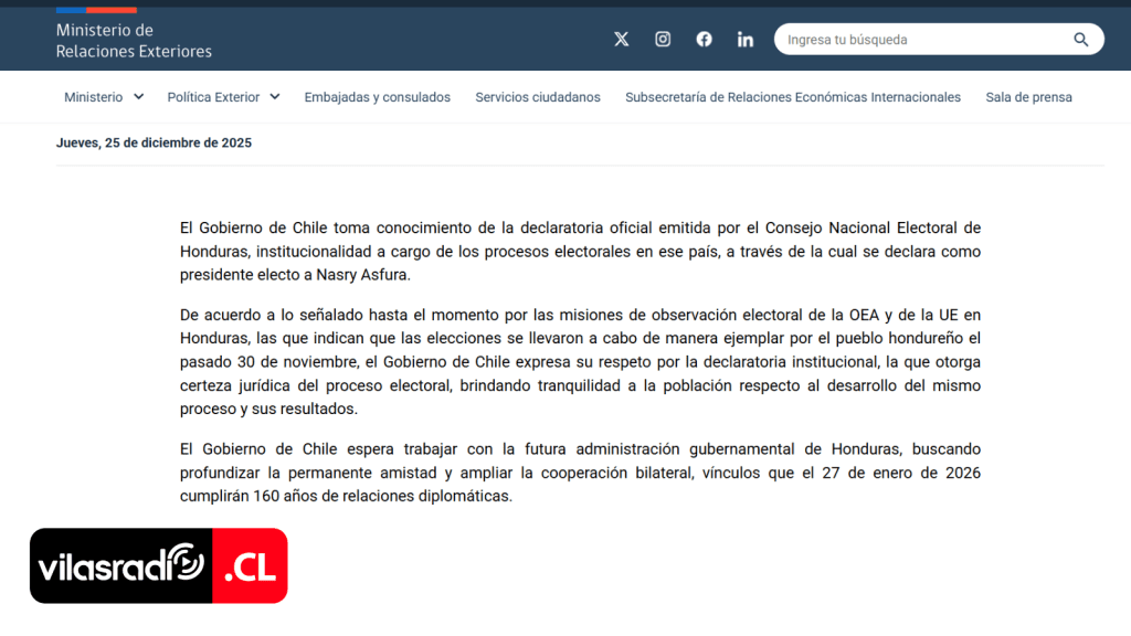 Es así como a través de una declaración pública, la Cancillería chilena manifestó su respaldo a la resolución del Consejo Nacional Electoral de dicho país. Para las autoridades nacionales, el pronunciamiento de los organismos electorales hondureños es fundamental para otorgar la certeza jurídica necesaria, garantizando así la paz social y la estabilidad política durante el periodo de transición.