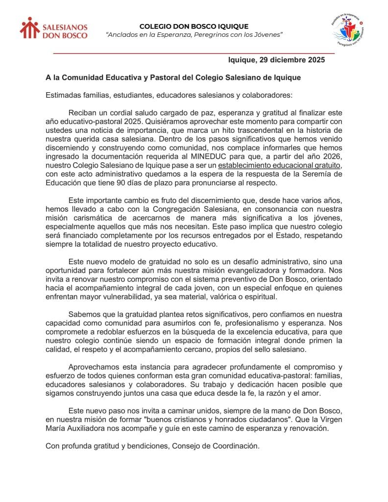 En relación con ello desde el establecimiento señalaron que: “Hemos ingresado la documentación requerida al MINEDUC para que, a partir del año 2026, nuestro Colegio Salesiano de Iquique pase a ser un establecimiento educacional gratuito”, señala el documento firmado por el Consejo de Coordinación, liderado por el representante del sostenedor, padre José Toledo Ralil.