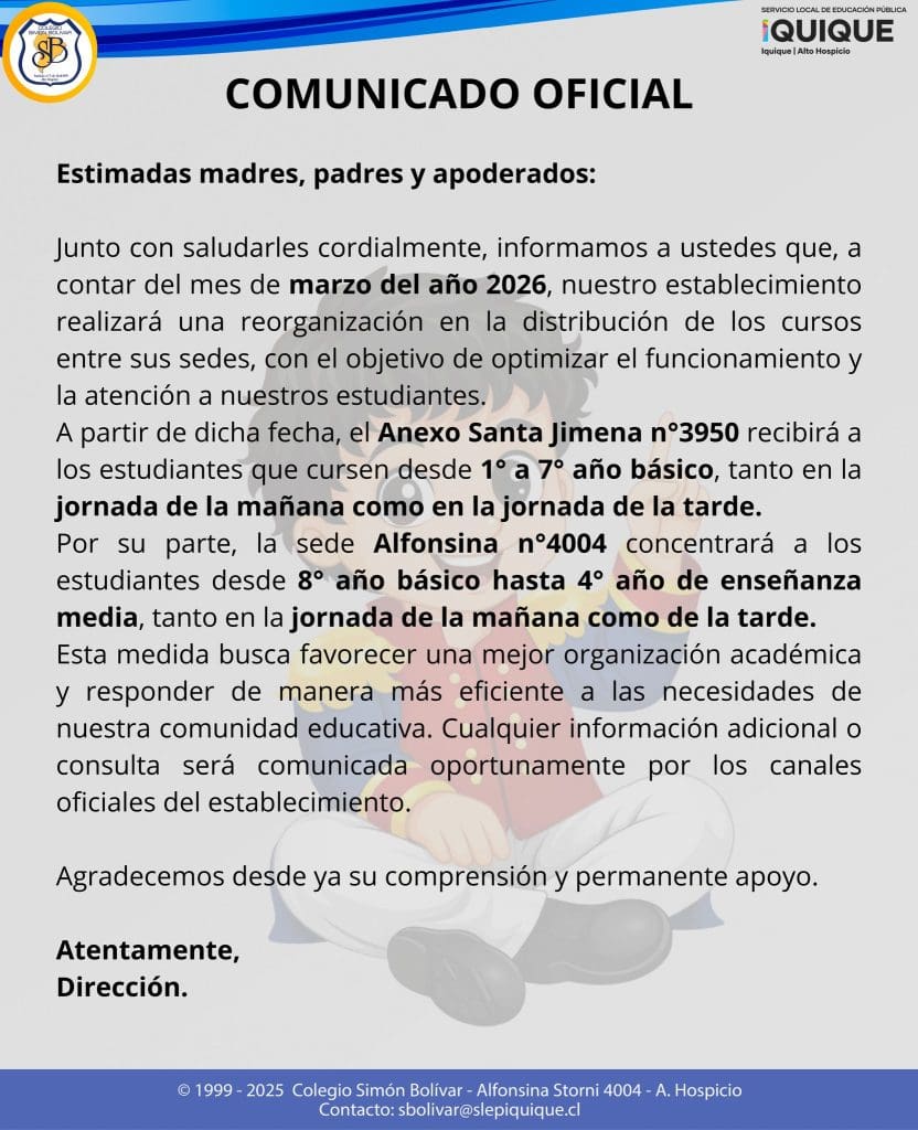 Desde la entidad informaron que cualquier detalle adicional será entregado oportunamente por los canales oficiales de comunicación del colegio. Asimismo, agradecieron el respaldo y apoyo permanente de las familias ante este cambio estructural que busca modernizar la gestión del Colegio Simón Bolívar para el periodo académico 2026.