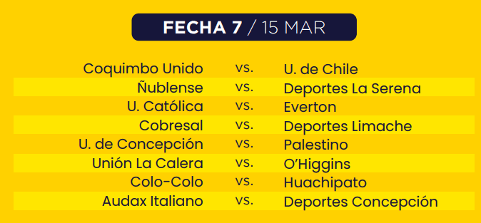 La fecha se completará el lunes, cuando Unión La Calera enfrente a O’Higgins en el Estadio Nicolás Chahuán Nazar, mientras que Colo Colo recibirá a Huachipato en el Estadio Monumental, partido que cerrará la séptima jornada del torneo de Primera División.