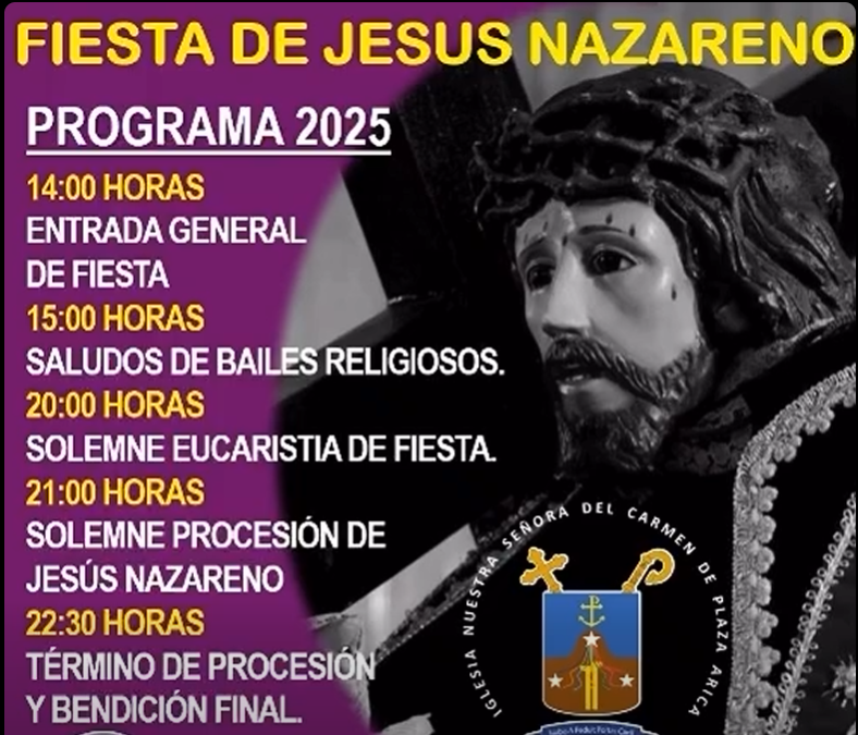 Según informó la capilla de Nuestra Señora del Carmen de Plaza Arica este sábado se realizarán diferentes actividades donde participará toda la comunidad devota de Jesús Nazareno las que se llevarán a cabo a partir de las 14:00 horas, momento en el cual se efectuará la entrada general de la fiesta.