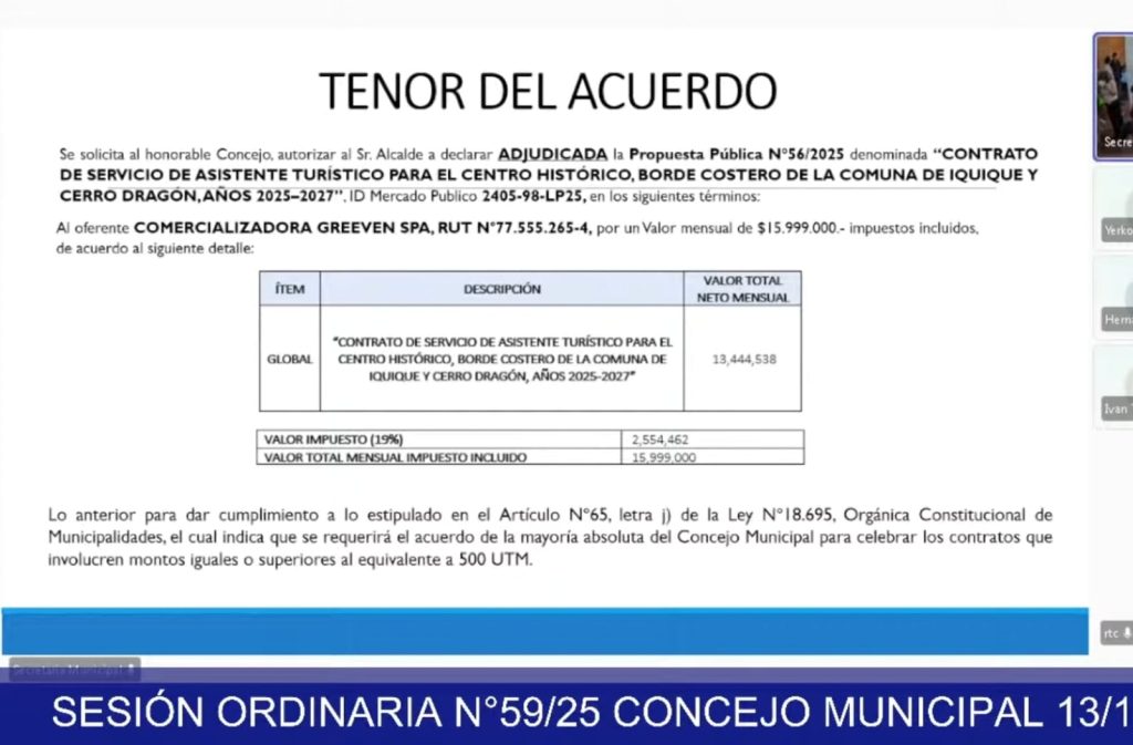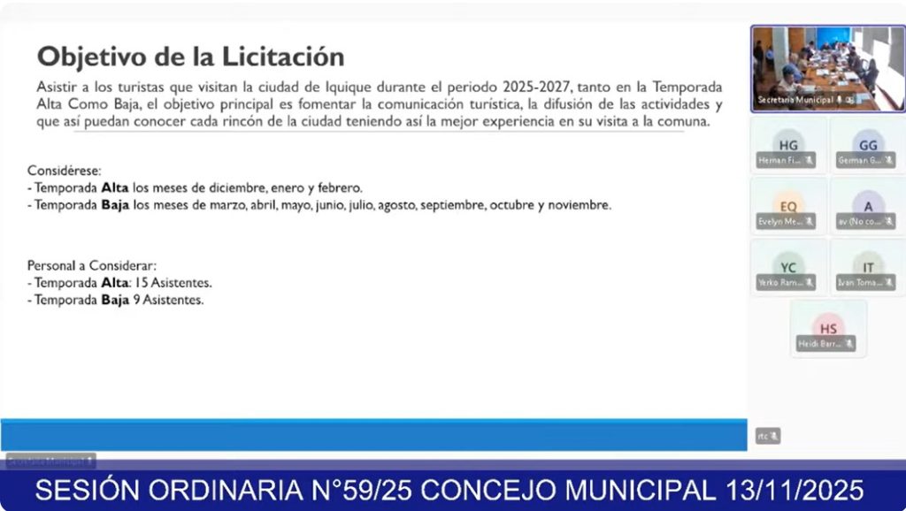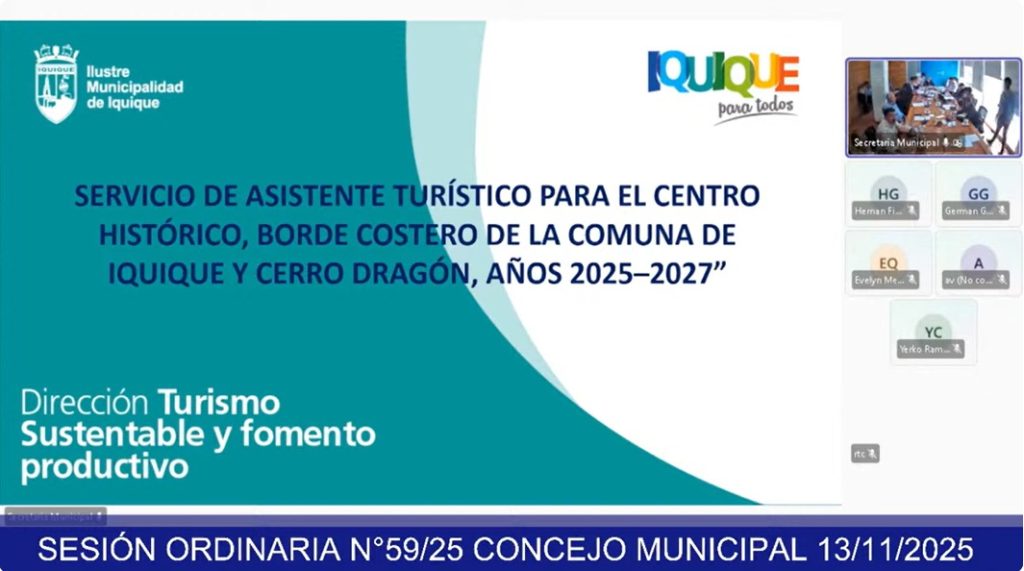 El Concejo Municipal de Iquique aprobó la contratación del Servicio de Asistentes Turísticos 2025–2027, destinado a reforzar la orientación, acompañamiento y apoyo preventivo en puntos estratégicos del Centro Histórico, el Borde Costero y el Cerro Dragón. El acuerdo corresponde a la Propuesta Pública N.º 56/2025 y considera un valor mensual de $15.999.000 (impuestos incluidos), con un total estimado de $324.000.000 para los 17 meses de ejecución.