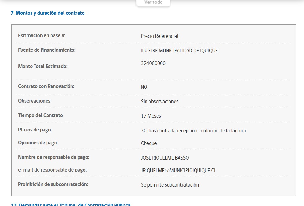 El valor neto mensual del servicio asciende a $13.444.538, al que se suman $2.554.462 correspondientes al impuesto del 19 %, totalizando $15.999.000 mensuales. El contrato no posee renovación automática, pero sí permite subcontratación.