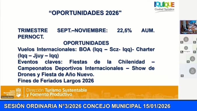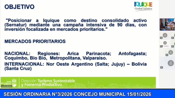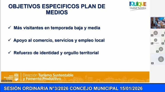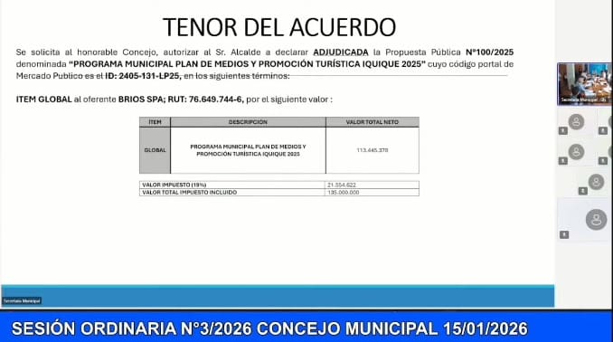 Con el desafío de romper la estacionalidad turística y reactivar una industria clave para la economía local, el Concejo Municipal de Iquique aprobó la adjudicación de la Propuesta Pública N°100/2025, que permitirá ejecutar un ambicioso plan de medios y promoción turística durante el año 2026, con una inversión de $135 millones.