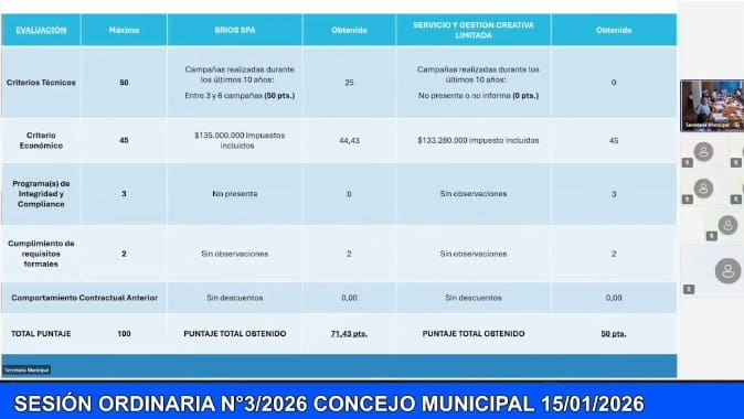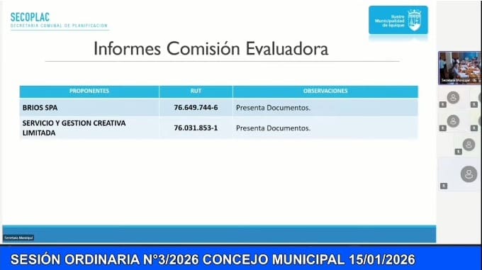 Durante la sesión ordinaria N°3, realizada el jueves 15 de enero de 2026, se informó que solo dos empresas presentaron ofertas a la licitación pública ID 2405-131-LP25: Brios SpA y Servicios y Gestión Creativa Limitada, ambas declaradas admisibles al no presentar observaciones formales en la etapa inicial del proceso.