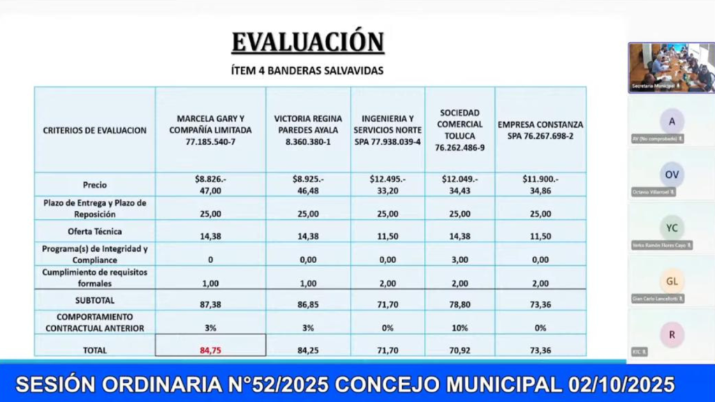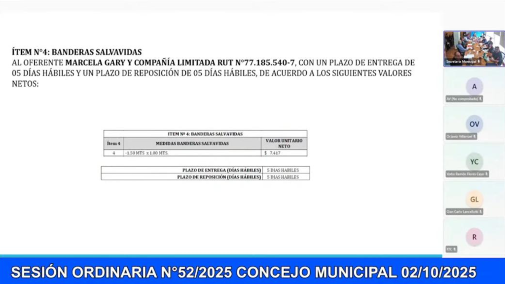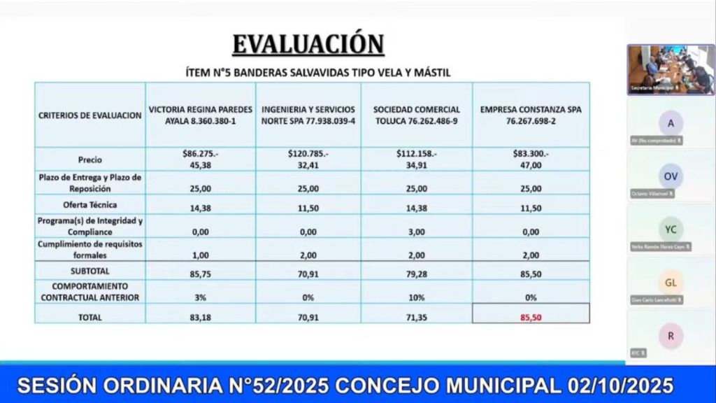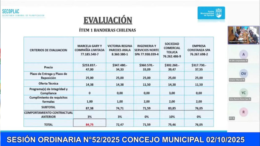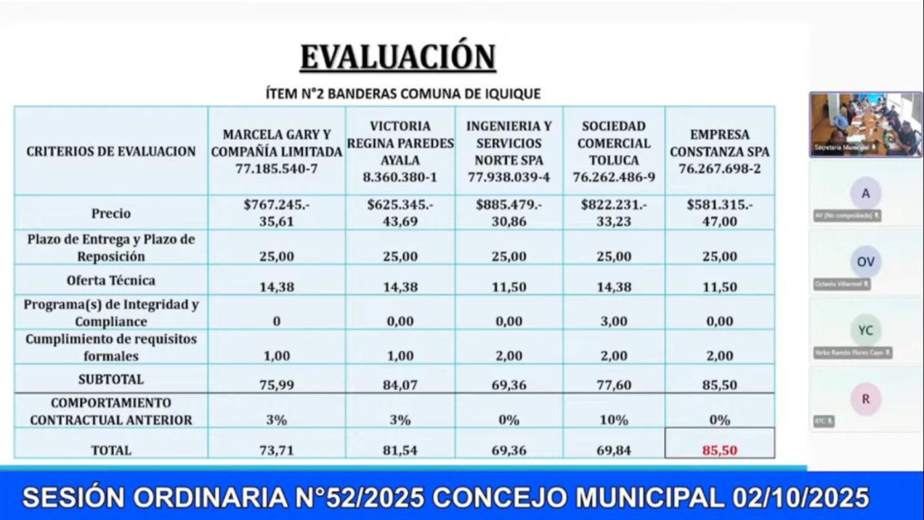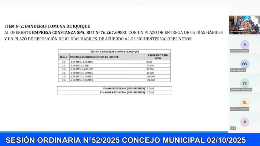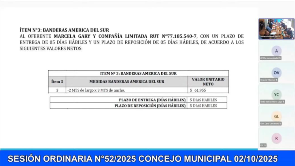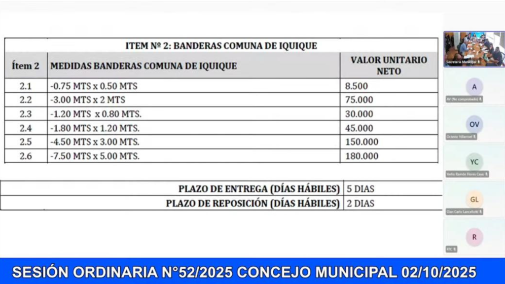 El Concejo Municipal de Iquique aprobó por unanimidad la adjudicación de la propuesta pública N°136/2024, correspondiente al contrato de suministro de banderas y accesorios para el periodo 2025, con un gasto estimado cercano a los 30 millones de pesos anuales.