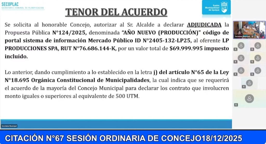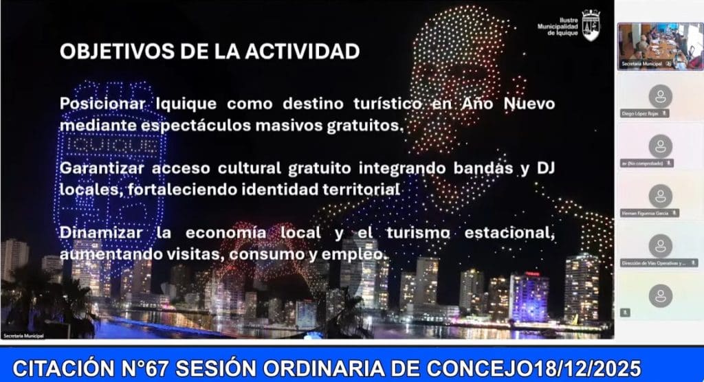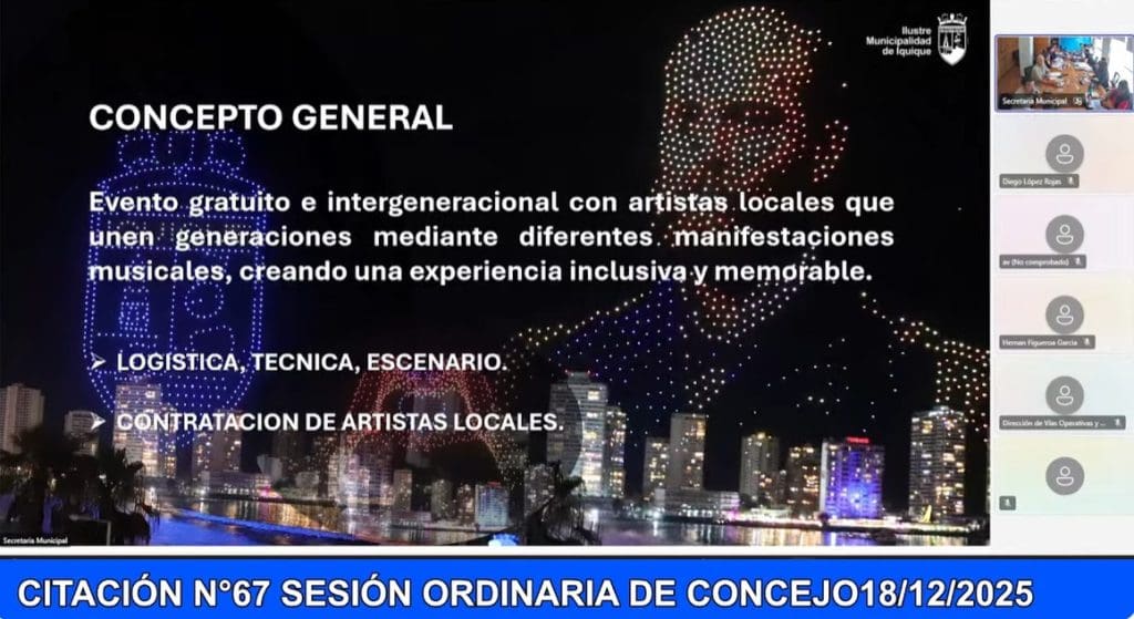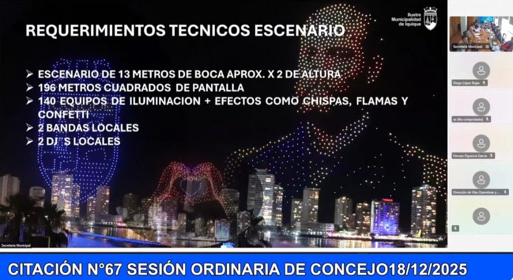 El Show de Año Nuevo 2026 en Iquique tendrá un costo total que supera los $760 millones, cifra que quedó en evidencia tras una extensa y tirante sesión ordinaria del Concejo Municipal N° 67, donde se aprobaron los principales contratos asociados al evento.