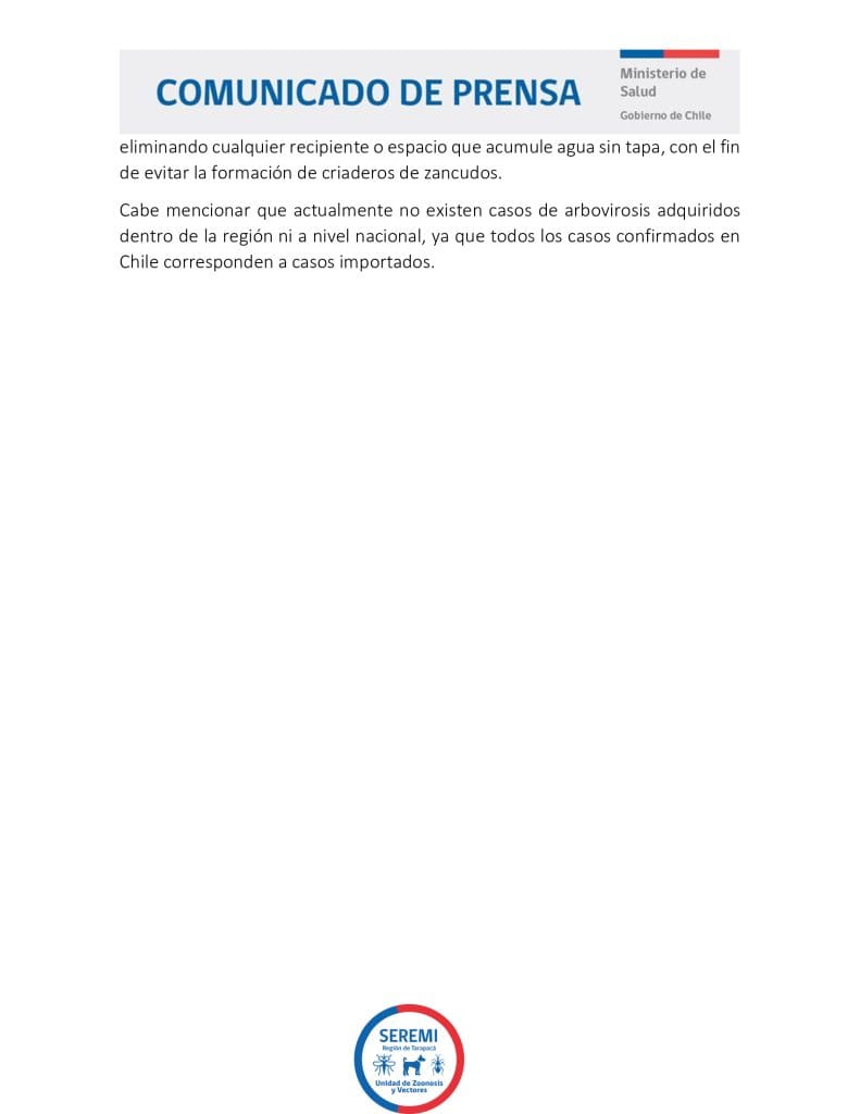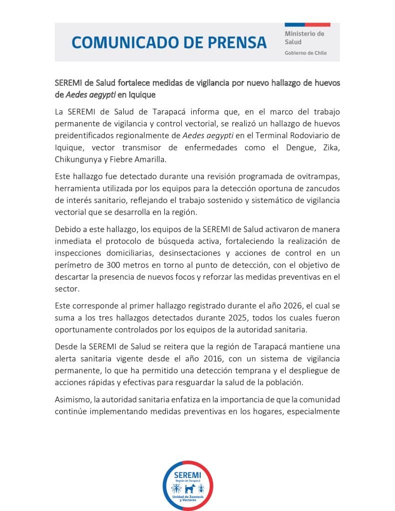 En el marco de las actividades por el Día Mundial contra el Cáncer, desarrolladas este martes 4 de febrero en Plaza Prat, la Seremi (s) de Salud de Tarapacá, Dolores Romero, confirmó el hallazgo de huevos del mosquito Aedes aegypti en el Terminal de Buses de Iquique, vector responsable de la transmisión de enfermedades como dengue, fiebre amarilla, chikungunya y zika.