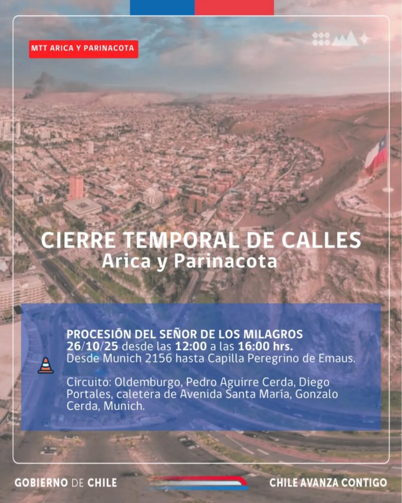 Durante toda la semana en la ciudad de Arica se han llevado a cabo distintas celebraciones en honor al Señor de los Milagros, festividad religiosa que convoca a cientos de fieles y que este domingo 26 de octubre se realizará su procesión, debido a ello, conoce los cortes de calle para ese día.