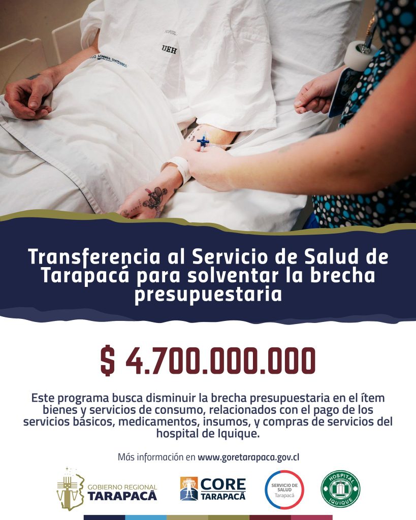 El Consejo Regional de Tarapacá (CORE) aprobó la transferencia de $4.700 millones desde el Gobierno Regional (GORE) al Servicio de Salud de Tarapacá, con el propósito de garantizar la continuidad de las operaciones del Hospital Regional “Dr. Ernesto Torres Galdames” durante los últimos meses de 2025.