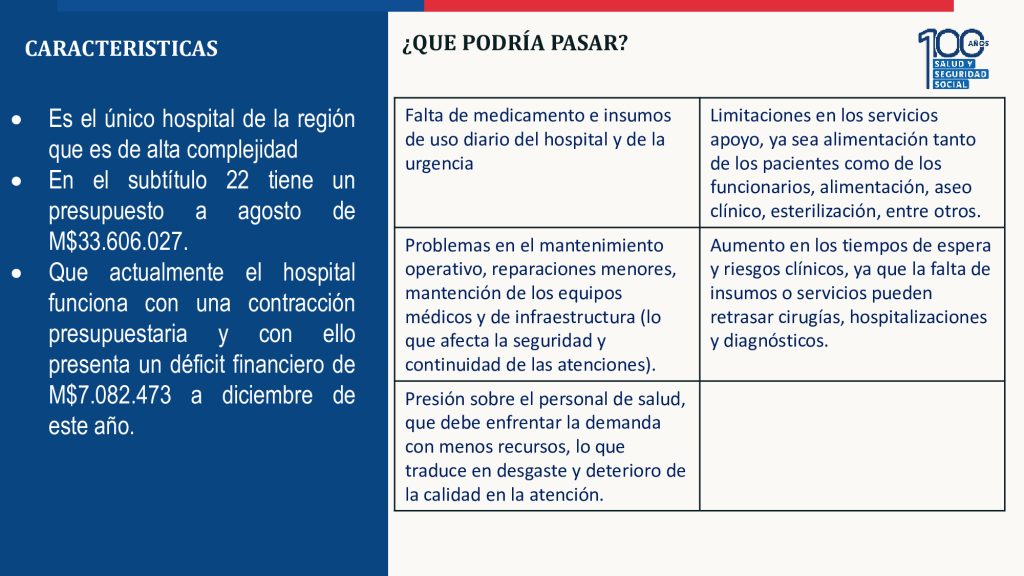 Durante la última Comisión de Salud del CORE, Milla expuso que el hospital presentó un déficit inicial de 15 mil millones de pesos, cifra que, tras medidas de ahorro interno, se redujo a 7 mil millones. Sin embargo, el aporte regional aprobado alcanza solo 4.700 millones, lo que, según el consejero, “no cubre completamente las necesidades operativas del establecimiento”.