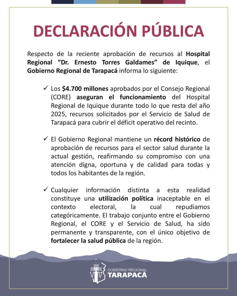 Respecto de la reciente aprobación de recursos al Hospital Regional «Dr. Ernesto Torres Galdames» de Iquique, el Gobierno Regional de Tarapacá informa lo siguiente: