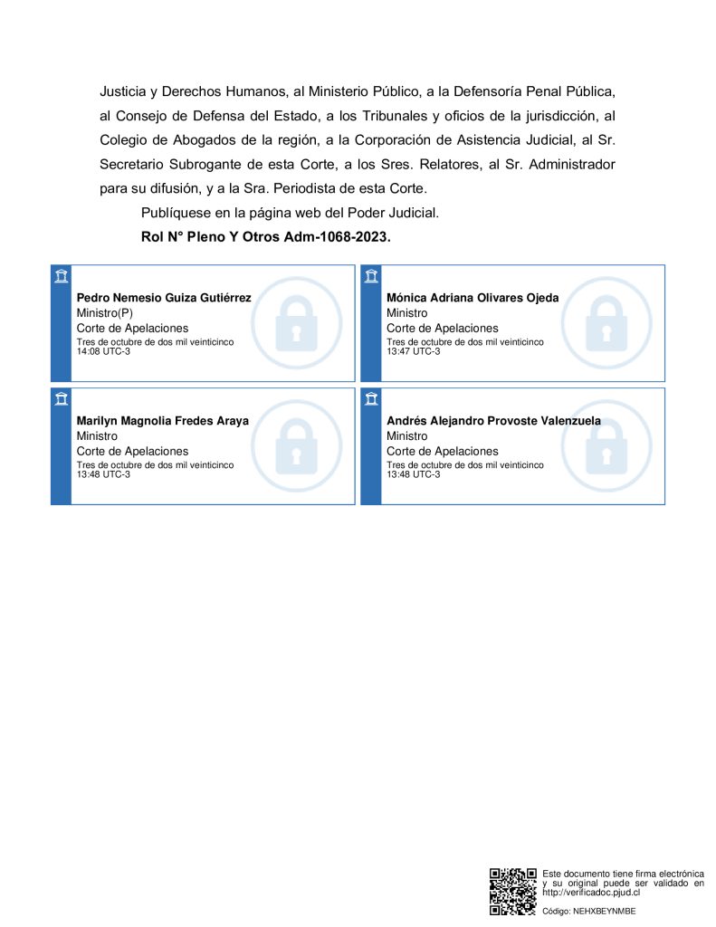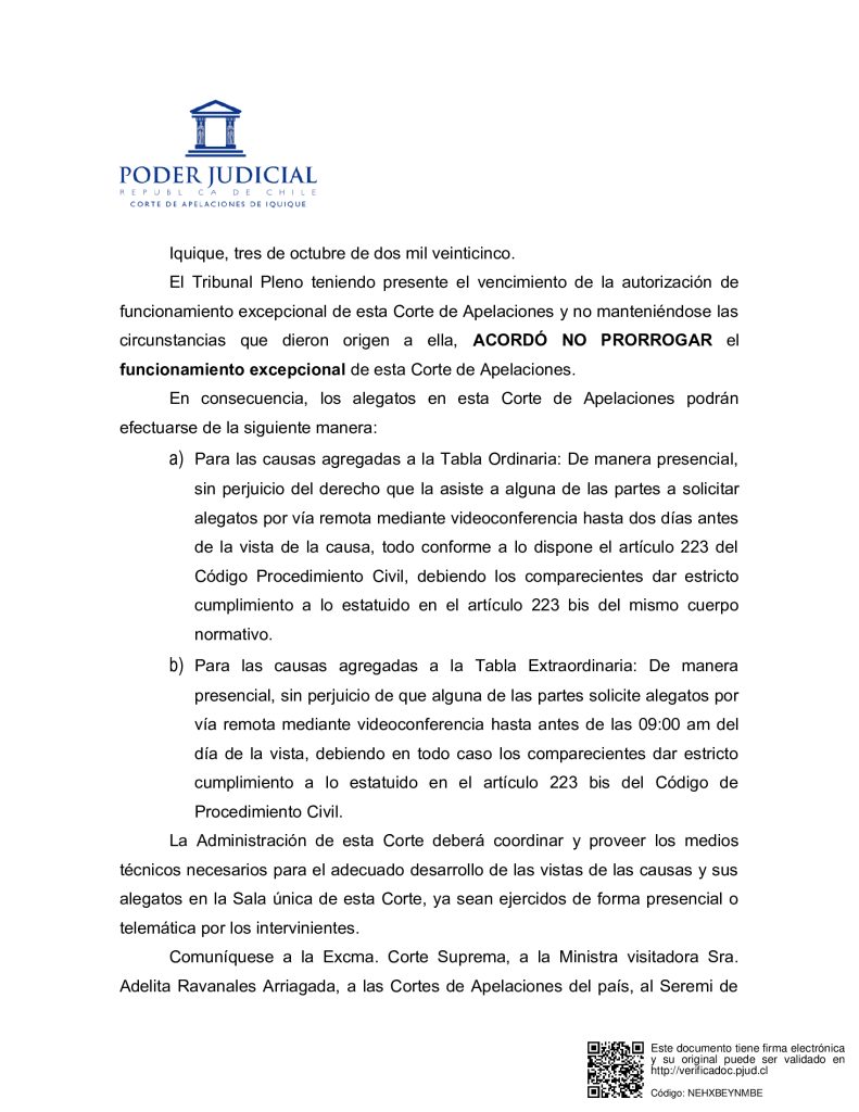 El Pleno de la Corte de Apelaciones de Iquique informó que no se prorrogará la modalidad de funcionamiento excepcional que había regido hasta ahora. La decisión se adoptó considerando el vencimiento de la autorización excepcional y que ya no se mantienen las circunstancias que dieron origen a esta medida.