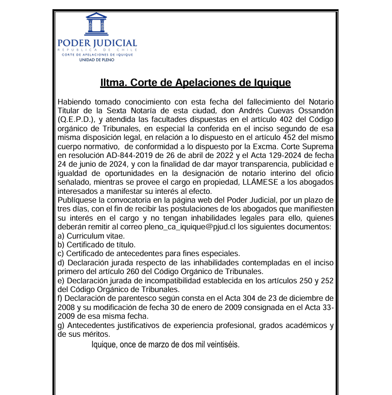 La Corte de Apelaciones de Iquique abrió un proceso de postulación dirigido a abogados interesados en asumir el cargo de notario interino de la Sexta Notaría de la ciudad. Esta convocatoria surge tras el reciente fallecimiento del notario titular, don Andrés Cuevas Ossandón (Q.E.P.D.), con el objetivo de mantener la continuidad del servicio mientras se provee la vacante en propiedad.
