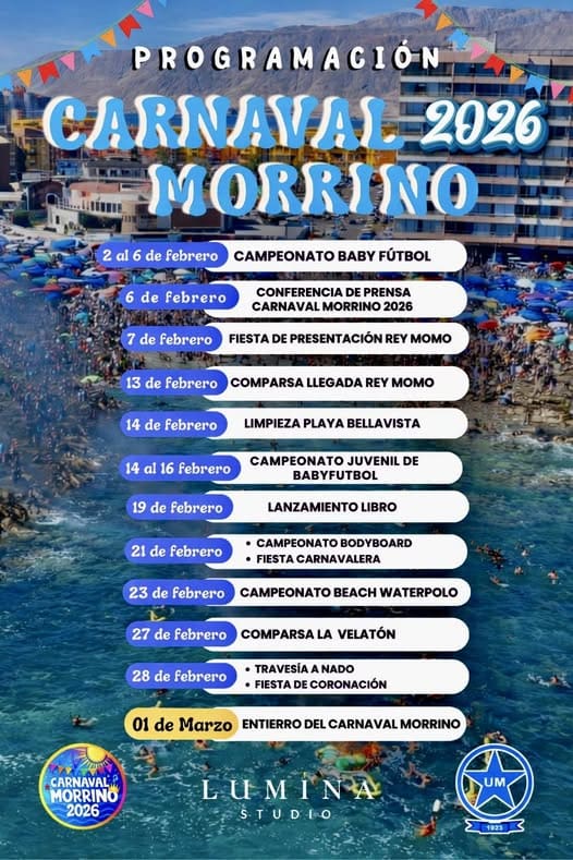El Carnaval del Morro 2026 se tomará Iquique desde comienzos de febrero hasta el 1 de marzo con una extensa programación que incluye campeonatos deportivos, comparsas, fiestas, actividades culturales y el tradicional Entierro del Carnaval en Playa Bellavista.