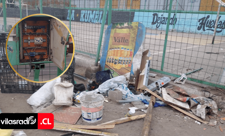 “Es muy peligroso, hay cables a la vista y además esto se está transformando en un basural. Así no se puede usar la cancha”, advirtieron residentes. La infraestructura deportiva también presenta un deterioro evidente: arcos sin malla, tableros en mal estado y ausencia de implementos básicos, lo que limita su uso y refleja la falta de mantención.