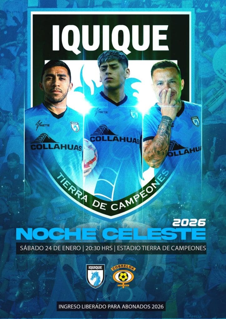Este sábado por la noche, Deportes Iquique y Cobreloa animarán una nueva versión de la tradicional Noche Celeste, partido de presentación del elenco nortino de cara a la temporada 2026. El encuentro se disputará en el Estadio Tierra de Campeones, a partir de las 20:30 horas, y marcará el reencuentro del equipo celeste con su hinchada antes del inicio oficial de la competencia.