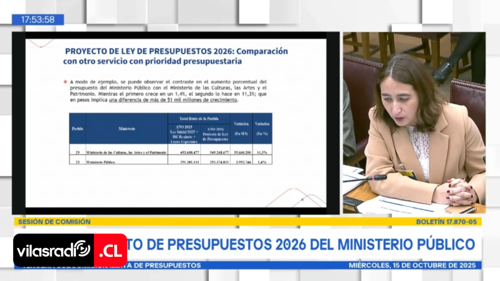 En comparación, el Ministerio de las Culturas, las Artes y el Patrimonio recibirá un incremento del 11,3%, equivalente a más de 55.000 millones de pesos. “Ya hemos señalado que la variación que nosotros tenemos en nuestro presupuesto es solo una variación de 1,4%, mientras que Cultura crece 11,3%, lo que representa una diferencia de más de 51.000 millones de pesos”, puntualizó la directora.