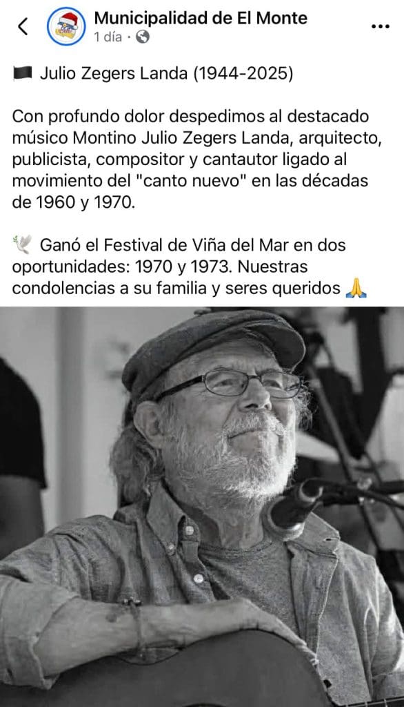 Desde la Municipalidad de El Monte expresaron su pesar mediante un comunicado oficial: “Con profundo dolor despedimos al destacado músico montino Julio Zegers Landa, arquitecto, publicista, compositor y cantautor ligado al movimiento del Canto Nuevo en las décadas de 1960 y 1970”. El texto subraya que sus diversas disciplinas profesionales alimentaron constantemente su visión creativa a lo largo de los años.