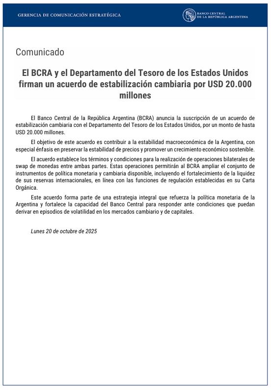 En un movimiento que sacudió los mercados globales y volvió a poner a Argentina en el centro del tablero financiero mundial, Estados Unidos anunció un acuerdo de estabilización cambiaria por 20.000 millones de dólares con el Banco Central de la República Argentina (BCRA). La operación —calificada por analistas como “el rescate del siglo”— busca contener la volatilidad del peso, apuntalar las reservas y dar oxígeno a un gobierno acorralado por la inflación, la deuda y las urnas.