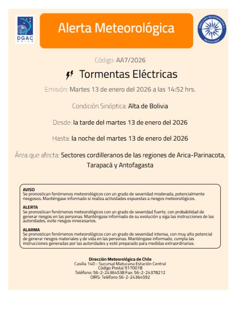 Un nuevo episodio de inestabilidad atmosférica mantiene bajo aviso y alerta meteorológica a sectores cordilleranos del extremo norte del país. La Dirección Meteorológica de Chile (DMC) y la Dirección General de Aeronáutica Civil (DGAC) informaron la probabilidad de tormentas eléctricas y precipitaciones de intensidad normal a moderada, asociadas a la condición sinóptica conocida como Alta de Bolivia.