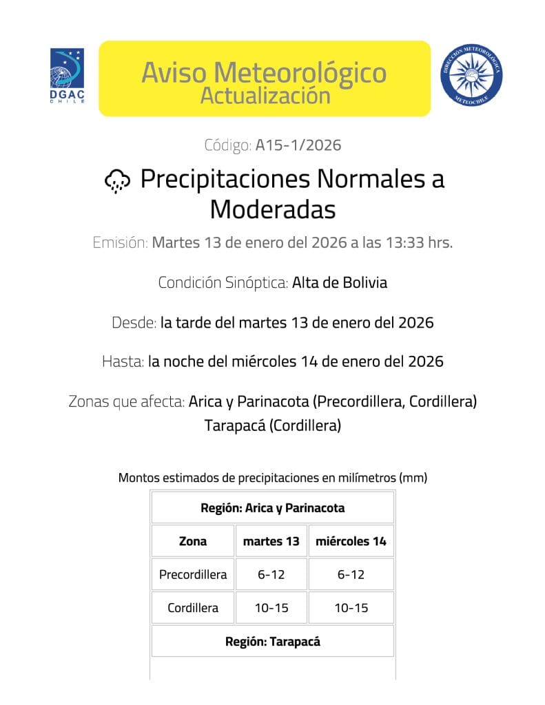 Según el detalle oficial, los fenómenos se concentrarán desde la tarde del martes 13 hasta la noche del miércoles 14 de enero, afectando principalmente a la precordillera y cordillera de Arica y Parinacota, además de la cordillera de Tarapacá.