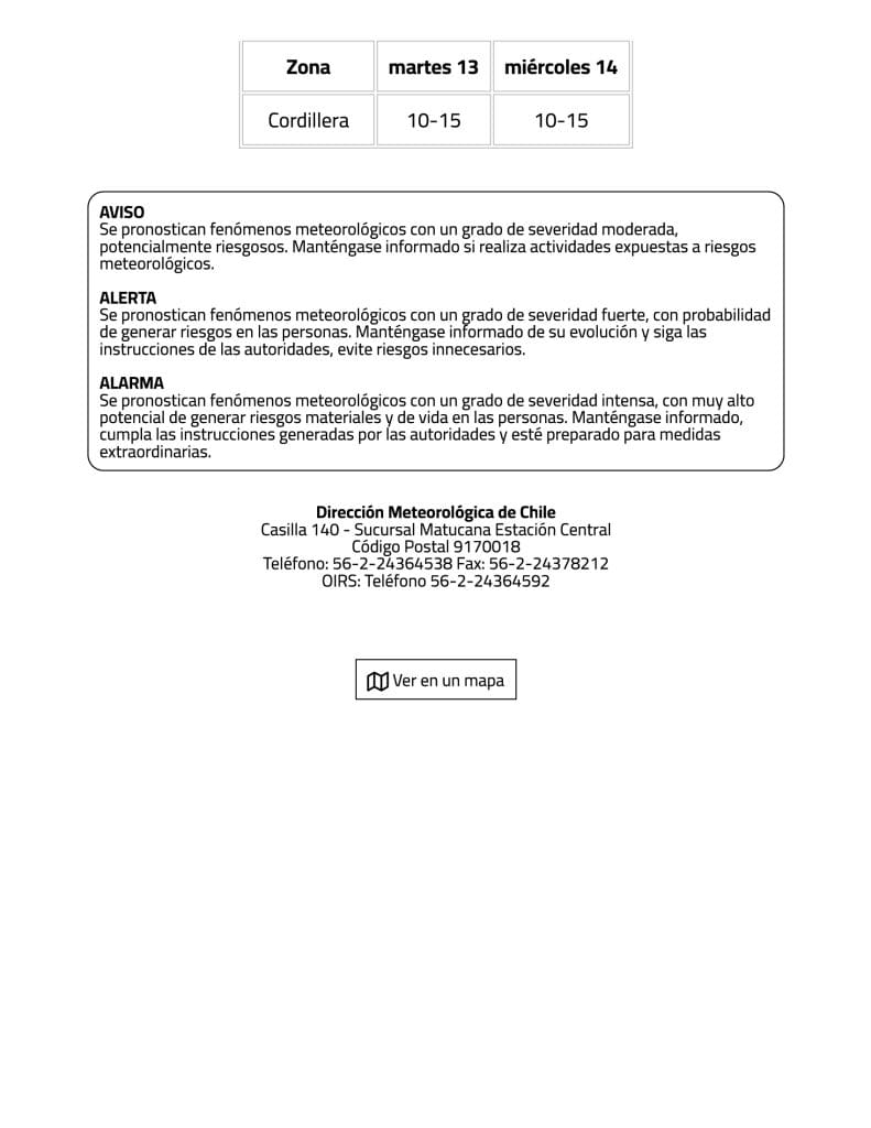 Paralelamente, la DGAC emitió una alerta por tormentas eléctricas para la jornada del martes 13, advirtiendo que se trata de eventos de severidad fuerte, con potencial impacto en la seguridad de las personas, especialmente en actividades al aire libre y desplazamientos por rutas cordilleranas.