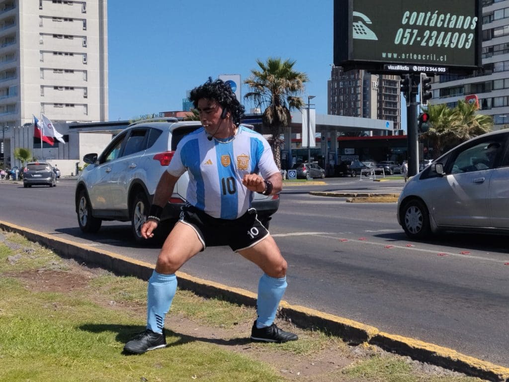 El mediodía en Iquique tuvo hoy un giro inesperado. Por aviso de auditores de Vilas Radio, el equipo llegó hasta el bandejón central de Playa Brava con Av. Arturo Prat, donde la rutina veraniega fue interrumpida por una escena que mezcló humor, improvisación y cercanía: Antonio Bello, conocido creador de contenido de TikTok, personificaba a Diego Armando Maradona en plena vía pública, convirtiendo el sector en un verdadero espectáculo al aire libre.