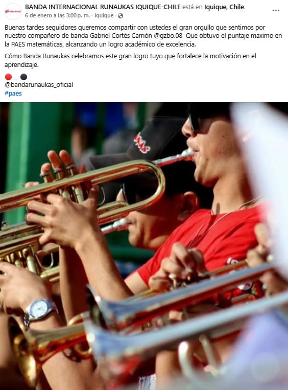La noticia comenzó a circular de manera silenciosa, casi con la misma humildad que caracteriza al protagonista. Fue una publicación de la Banda Internacional Runaukas la que reveló que uno de sus integrantes, Gabriel Cortés Carrión, había obtenido el puntaje máximo —1.000 puntos— en la PAES de Matemática 1, un logro académico excepcional que rápidamente despertó orgullo, emoción y admiración en la comunidad iquiqueña.