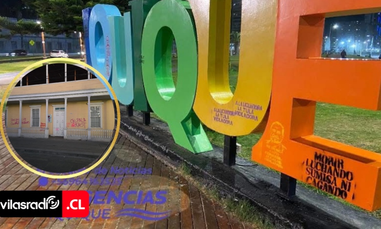 Uno de los puntos más afectados fue el sector de Cavancha, específicamente el parador fotográfico con las letras de «IQUIQUE». El espacio amaneció con múltiples rayados y consignas dirigidas principalmente contra la administración municipal de Alto Hospicio y su alcalde, Patricio Ferreira.
