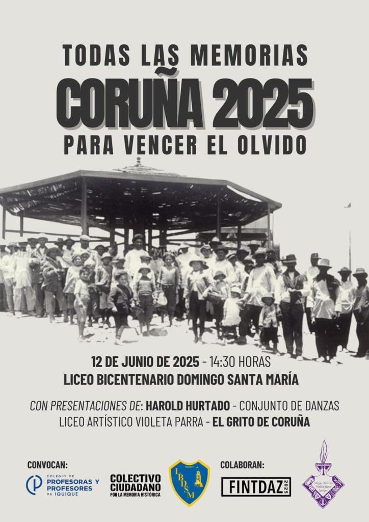 Para honrar la memoria de los hombres y mujeres de la pampa asesinados un 05 de junio de 1925, en la Salitrera Coruña y otros campamentos de la zona, se realizará un acto conmemorativo el próximo jueves 12 de junio, a las 14.30 horas, en el Liceo Bicentenario Domingo Santa María.