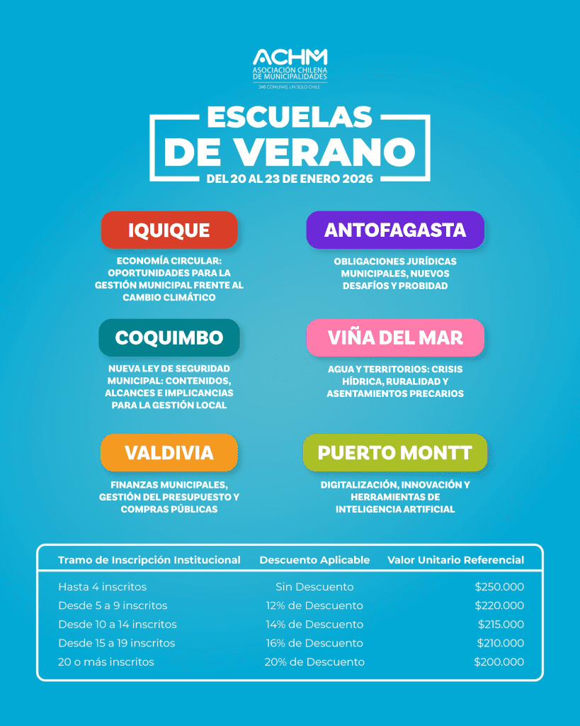 La Asociación Chilena de Municipalidades (ACHM) anunció la realización de una nueva versión de sus Escuelas de Verano, instancia de formación dirigida a autoridades y funcionarios municipales de todo el país, que este año tendrá como sede la ciudad de Iquique, entre el 20 y el 23 de enero de 2026.