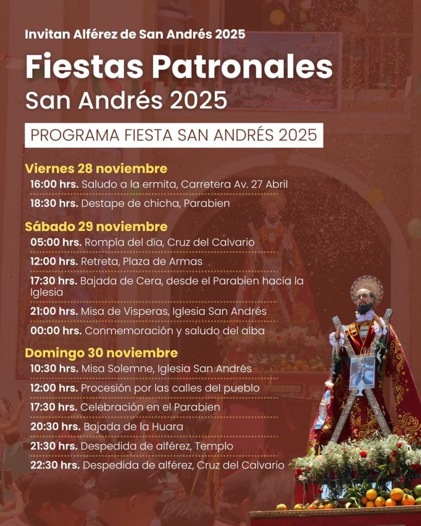 La organización de la Fiesta de San Andrés ha dado a conocer el programa oficial de sus celebraciones 2025. El calendario, que combina profundas tradiciones religiosas y actividades comunitarias, se desarrollará intensamente entre el 28 y el 30 de noviembre, y continuará con jornadas especiales el 6 y 7 de diciembre. Las ceremonias anuales buscan convocar a fieles y visitantes en torno a esta tradicional festividad.